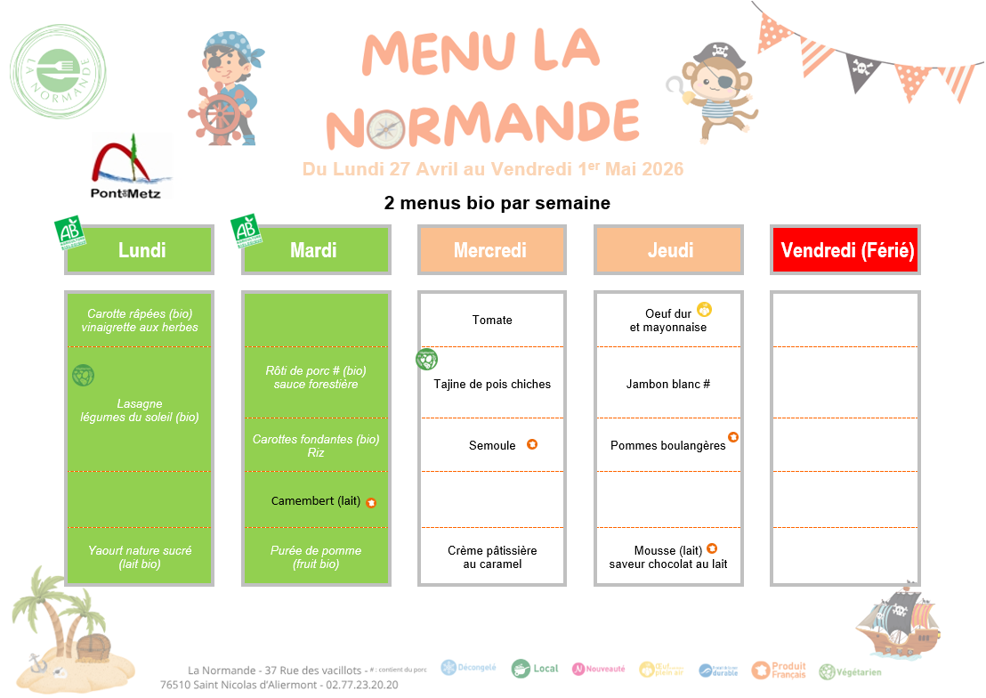 Menus du 27 avril au 30 avril 2026